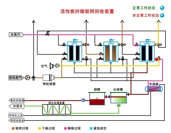 2).脱附再生:吸附回收工艺采用水蒸气将有机物脱附,将活性炭纤维再生。脱附蒸汽由吸附器顶部进入,加热活性碳纤维床层,脱附有机物。脱附后的活性碳纤维湿度和温度都很高,需要向吸附器内吹扫空气,使碳纤维吸附床层迅速降温降湿,随后进入下一个循环。