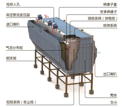 含有粉尘颗粒的气体,在接有高压直流电源的阴极线(又称电晕极)和接地的阳极板之间所形成的高压电场通过时,由于阴极发生电晕放电、气体被电离,此时,带负电的气体离子,在电场力的作用下,向阳板运动,在运动中与粉尘颗粒相碰,则使尘粒荷以负电,荷电后的尘粒在电场力的作用下,亦向阳极运动,到达阳极后,放出所带的电子,尘粒则沉积于阳极板上,而得到净化的气体通过设备顶部烟囱达标排放。