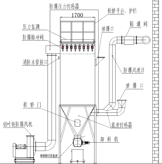 防爆除尘器是在普通除尘器的基础上增加安全措施,如主机增加:泄爆片、消防喷淋系统、温度传感器、压力传感器、压差传感器等;滤袋采用防静电型;风机采用防爆型;管道增加泄爆片、隔爆阀、温度传感器等。