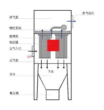 烧结板除尘器由灰斗、上箱体、中箱体、下箱体等部分组成,上、中、下箱体为分室结构。工作时,含尘气流通过尘气入口处的导流板进入中部箱体的尘气室,通过烧结板净化后的气体经风机排出。随着被阻留在烧结板表面涂层上粉尘的增加,定时或定差压工作方式的清灰控制系统将自动开启快开式脉冲阀,通过压缩空气来有效清除烧结板表面的粉尘,被喷落的粉尘在重力的作用下落入灰斗后排出。