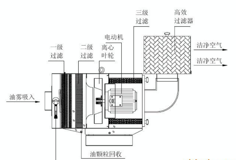 机械式油雾净化器,采用多级过滤逐级提高过滤精度的原理将油雾有效收集。一级过滤器捕集10um以上油雾,二级过滤器捕集3um以上油雾,三级过滤器捕集1um以上油雾量,后端可选配高效过滤器主要收集在加工过程中的烟雾。在内置风机的引力下,将油雾吸入到一级不锈钢除沫器。除沫器内放置层递式的金属除雾网,通过气流碰撞过滤丝网,把雾滴粘结下来,在过滤网内凝结成大油滴,然后在重力的作用下回流到集油盘中。二级过滤棉扩大过滤面积,降低流速将前段未捕集的气雾再次收集回流。离心叶轮在高速旋转离心力的作用下,再次将油雾结成油颗粒回流到油槽。三级过滤筒根据变换气道收集细小油雾及有效保护铝壳电动机,高效过滤器收集加工时产生的微量烟气。