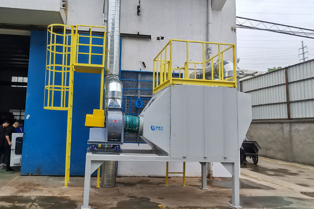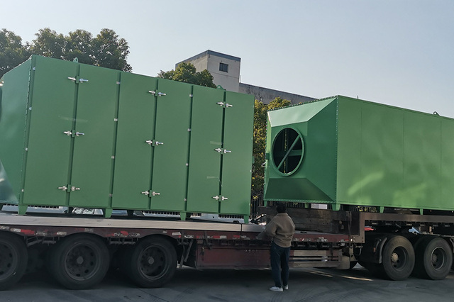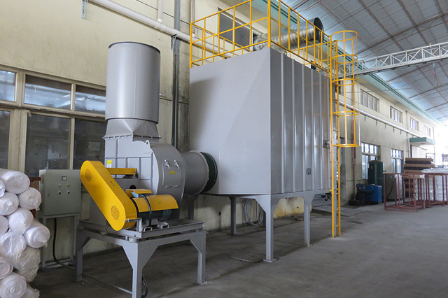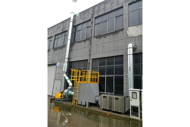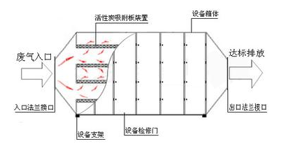 含有机物的废气经风机的作用,经活性炭吸附层,利用活性炭多微孔比表面积大的吸附能力强将有机物质吸附在活性炭微孔内,洁净气被排出。待处理的有机混合废气经引风机作用,先经过预处理过滤装置去除废气中的粉尘及杂质部分,否则直接吸附会堵塞活性炭的微缩孔,从而影响吸附效果甚至失效,经过初步过滤后“相对纯净的有机废气”进入互相吸附装置进行吸附净化处理,有机物质被活性炭特有的作用力截留在其内部,洁净气体通过烟囱排放到大气中。